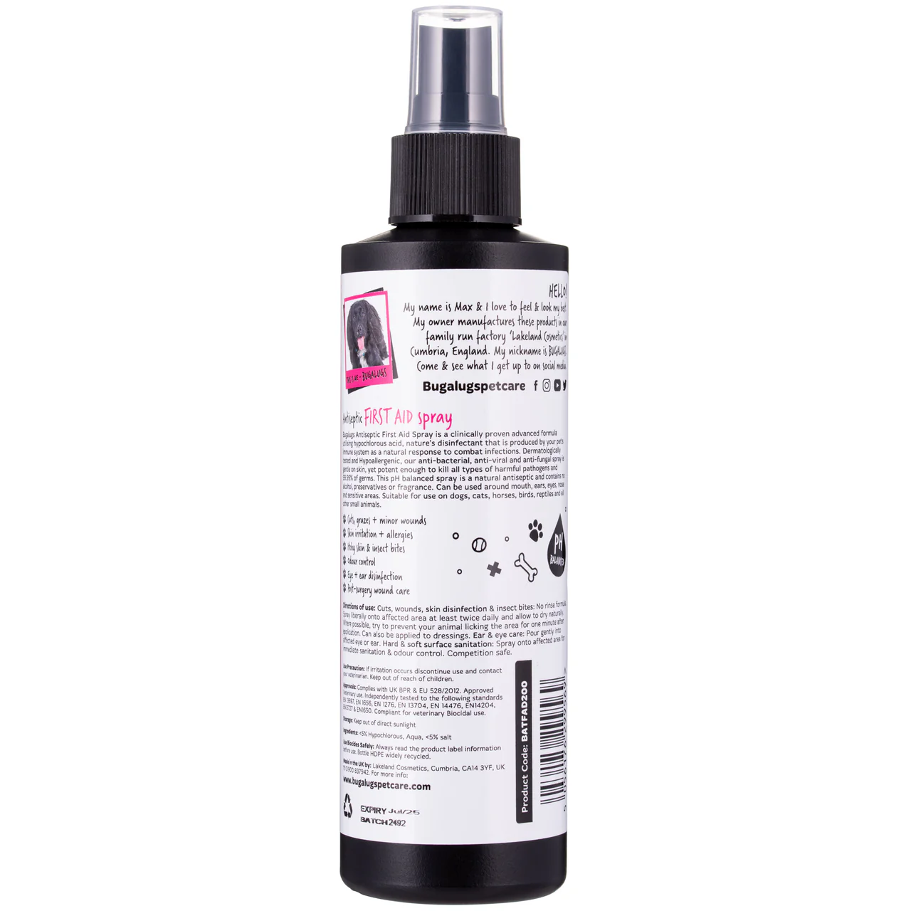 Bugalugs antiseptinis pirmosios pagalbos purškalas yra antiseptikas šunims ir katėms, kurio patikrinta formulė naudoja hipochloro rūgštį, žinomą dėl antibakterinių, antivirusinių ir priešgrybelinių savybių. Ši medžiaga natūraliai gaminama gyvūno imuninėje sistemoje kaip atsakas į uždegimą ir infekciją. Šis hipoalerginis purškalas yra švelnus odai ir padeda valyti bei spartinti smulkių žaizdų, nubrozdinimų ir odos pažeidimų gijimą. Jis tinka niežtinčiai odai, alergijoms, sudirgimams, smulkioms infekcijoms, vabzdžių įkandimams ir įdrėskimams.